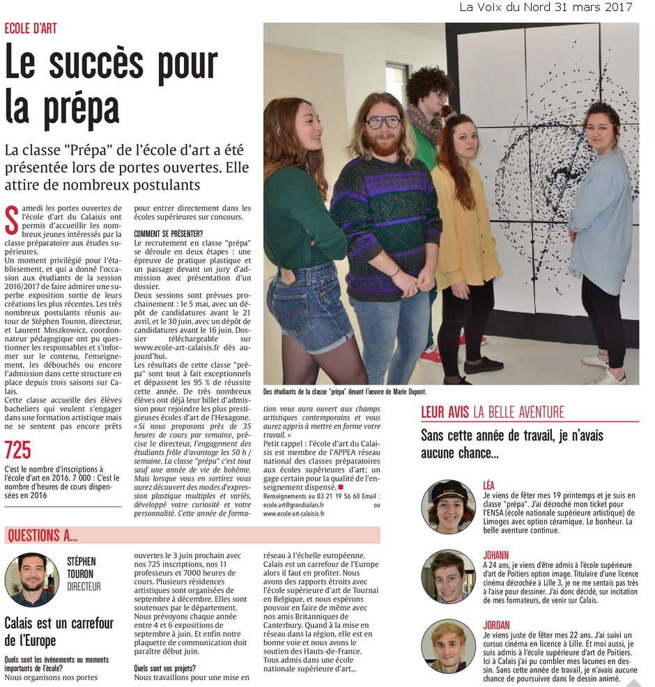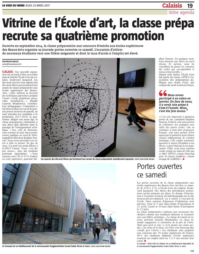 « Vitrine de l’école d’art, la classe prépa’ recrute sa quatrième promotion » (La Voix du Nord 23-03-2017) –